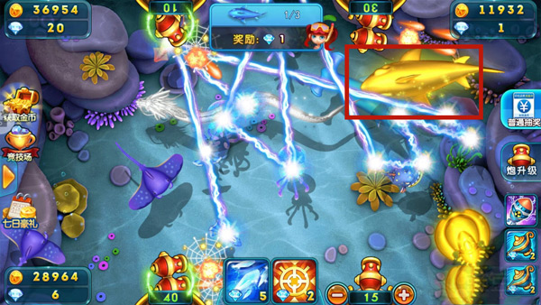 1、对着1-4分的小鱼群发射7号炮