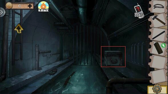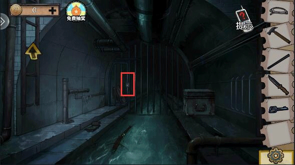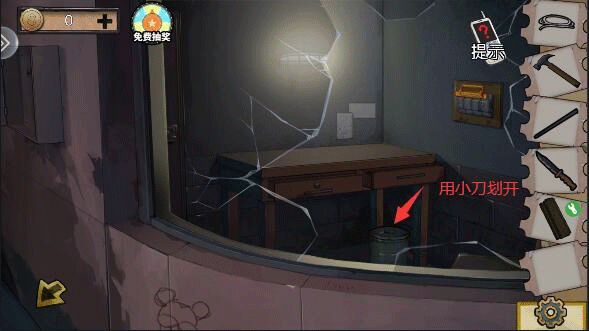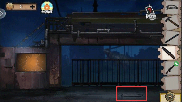 (2)弹力绳与剪刀组合,在于石块y型铁组合,获得弹弓,弹弓射上方瓶子,获得钥匙。钥匙打开下水道,地上获得螺丝刀,打开墙上框框获得闸刀。