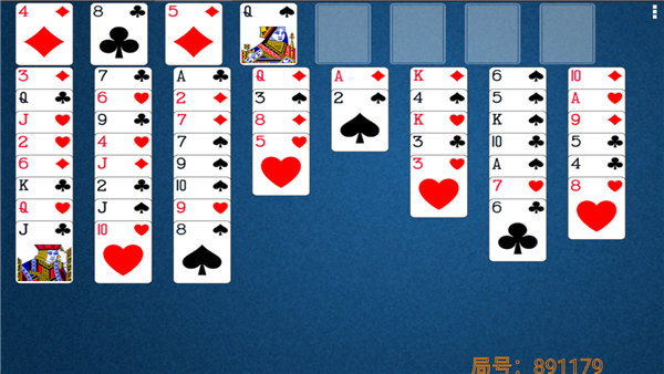 核心目标: 将一副扑克牌中所有牌,通过中转,最终按照从A到K的顺序,相同花色分别收集到右上角的四个“回收单元”中。