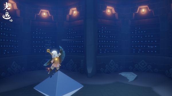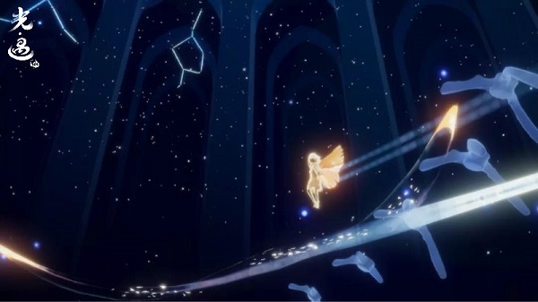 从底层大厅继续往上走,你将进入到一片漫无边际的星空中,熟悉的白鸟呈现出了半透明的形态,还有许多悬浮的巨石。在这里,你将需要乘着白鸟的力量上升,用心火点亮悬浮的棱石,通向更高的地方。