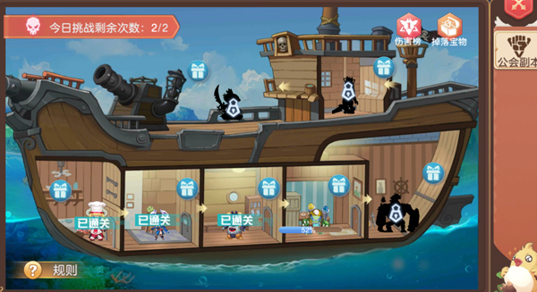 每个公会玩家每天有2次挑战的机会,玩家可以根据自己的职业特点选择,进入战斗后,若6回合未结束战斗,会有天罚神雷降临,所有角色宠物都会死亡,同时系统结算副本伤害,玩家可以获得大量的公会贡献值。结算伤害后,会进行公会排名。怪物血条是全公会同步的,当所有怪物血条清空,会开启当前关卡最终BOSS,每关最后一个击败BOSS的玩家可以获得终极战利品。