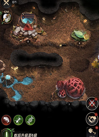 地下王国建设:游戏的核心是经营庞大的地下巢穴。你需要挖掘隧道、建造各种功能的房间(如幼虫室、真菌种植室、储存室等),还原了真实蚂蚁巢穴的立体结构。