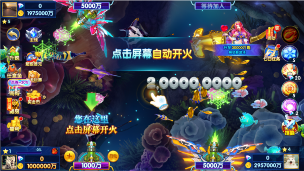 四人同屏竞技打渔,点击炮塔旁边自动就会自动捕鱼!