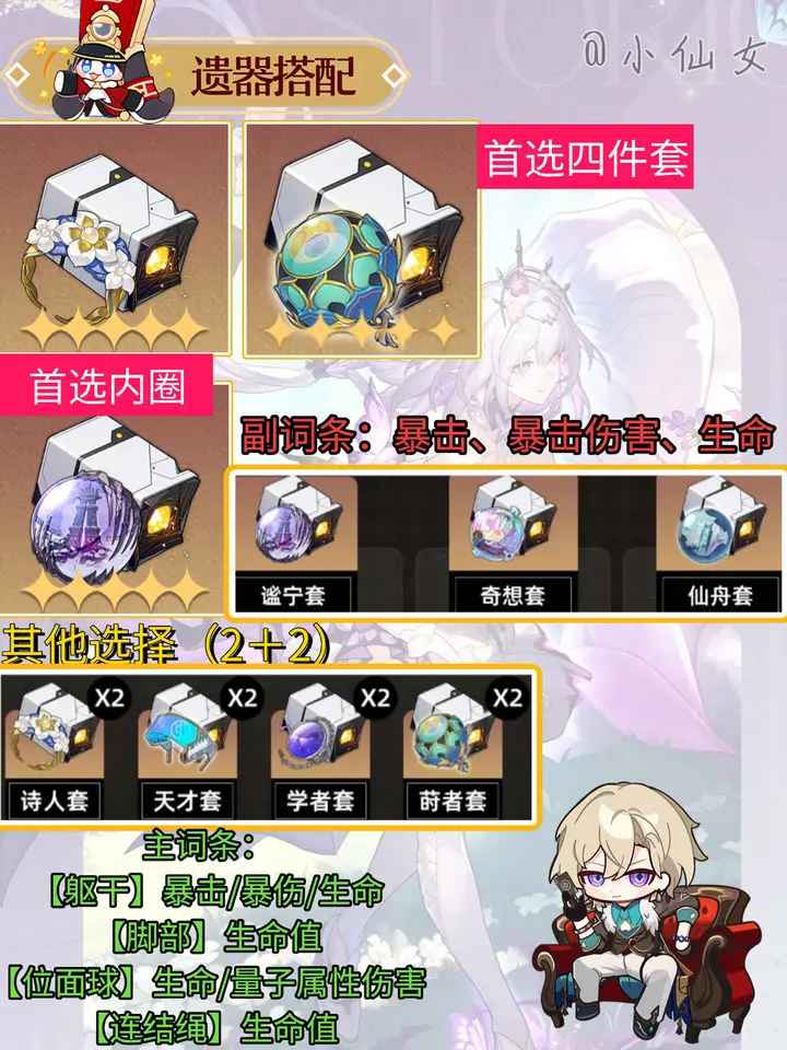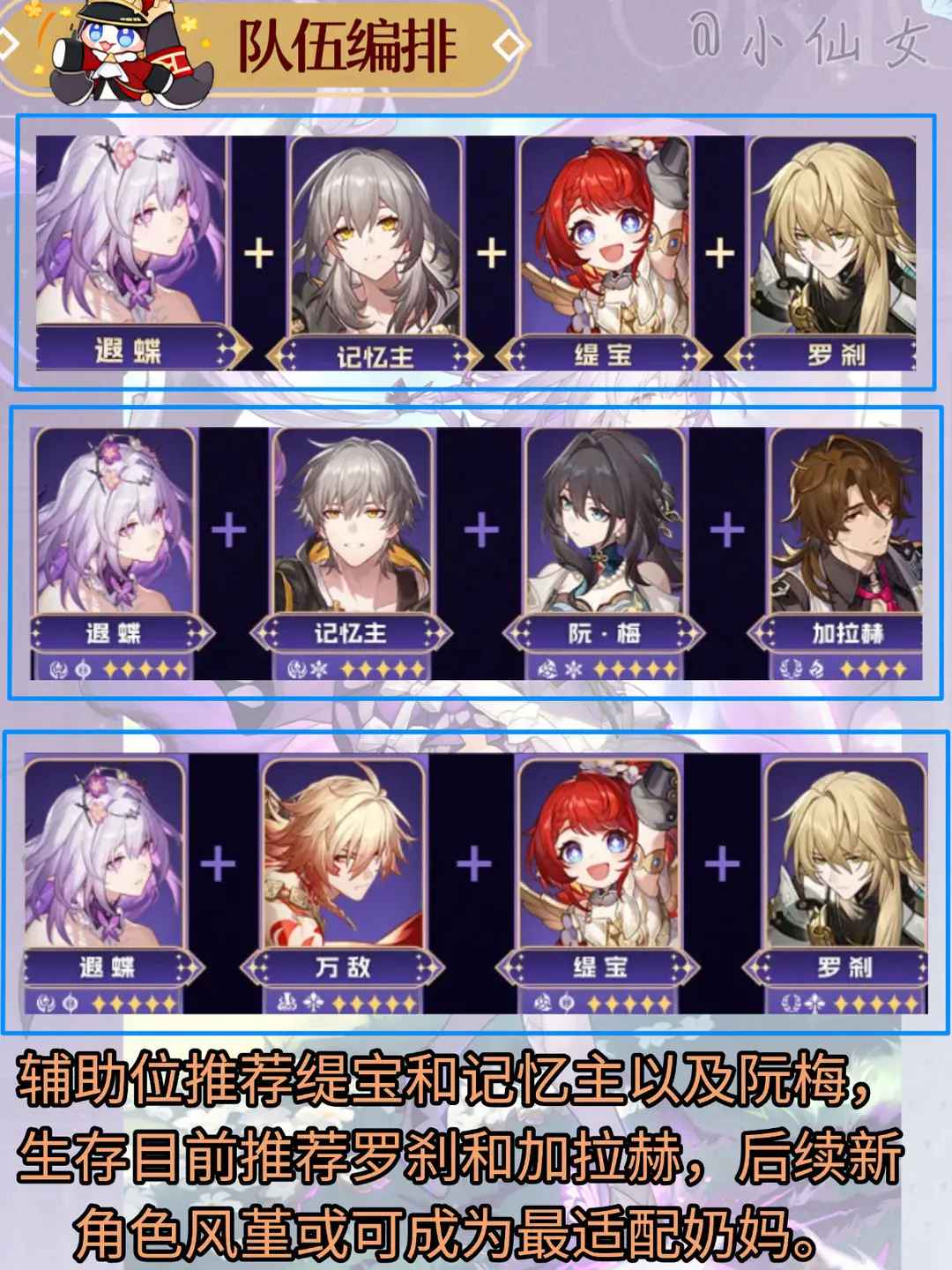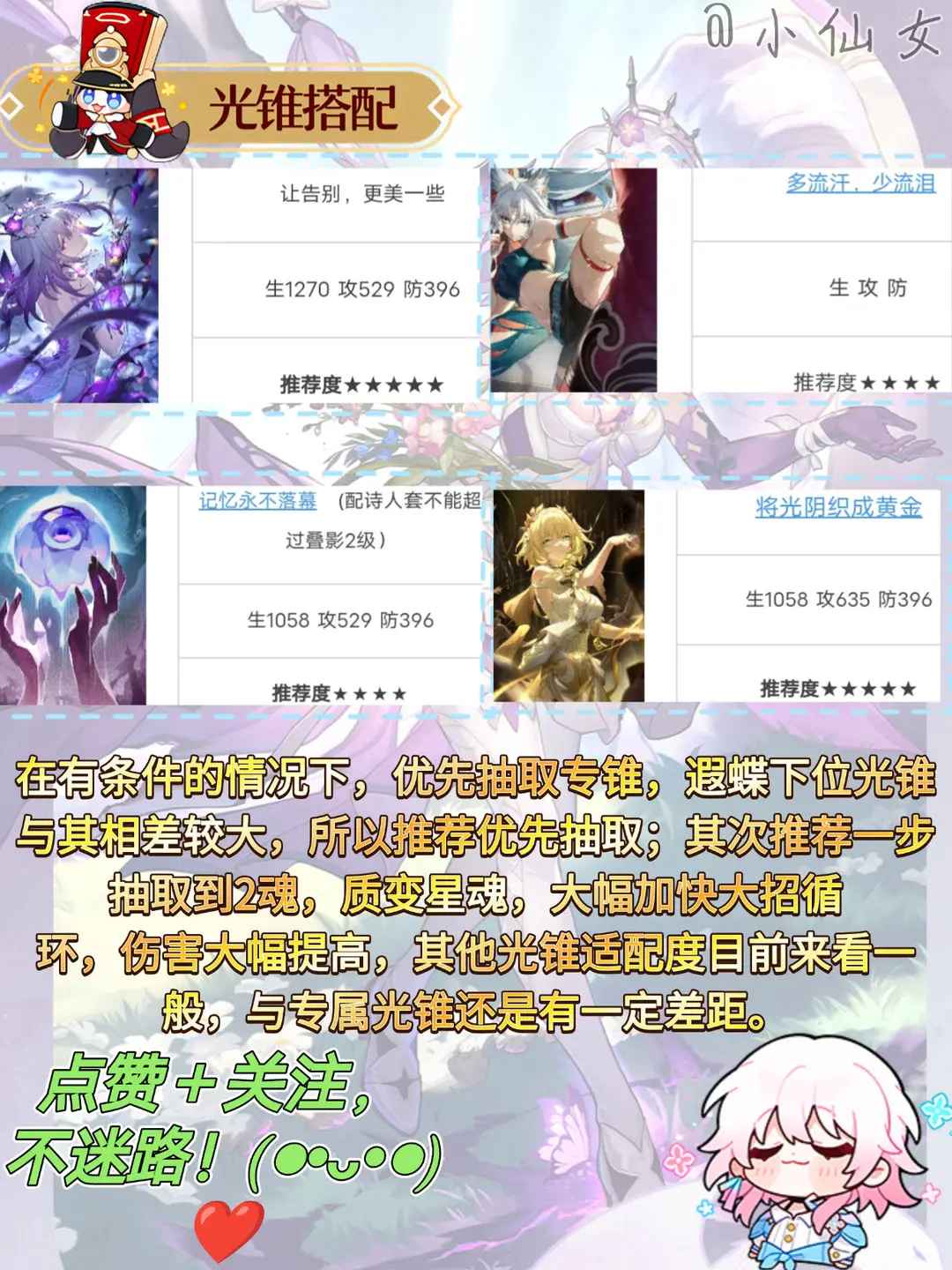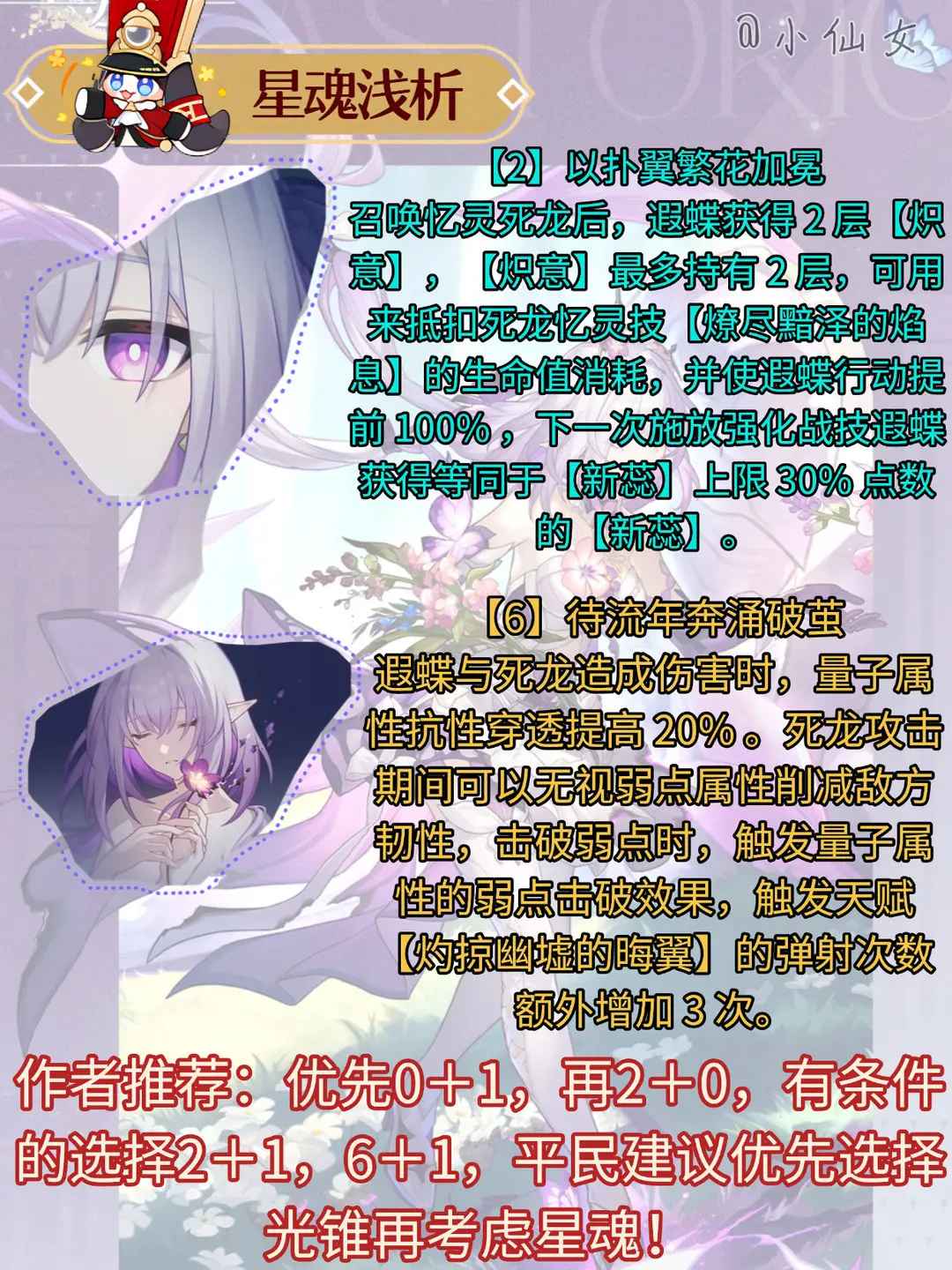 <遐蝶>作为记忆命途的生命大C,在3.x版本具有较高的抽取价值,同时也非常推荐有条件的玩家直接 2+1 毕业,角色在特效/ 强度上都有保证,在战斗环境上也可以享受较高的适配度,另一方面,由于是生命体系主 C,和常规的攻击力辅助适配度较低,已经抽取培养了<缇宝>的开拓者会有更好的体验。