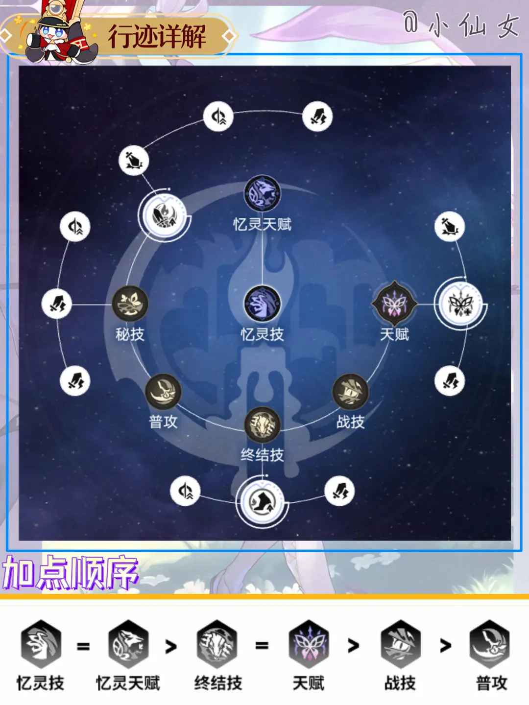 通过战技/天赋/终结技的配合获得"新蕊"值召唤"死龙·玻吕刻斯",通过忆灵技的灵活使用让死龙担任主力输出,有平稳输出3回合和爆发输出1回合两种循环模式。