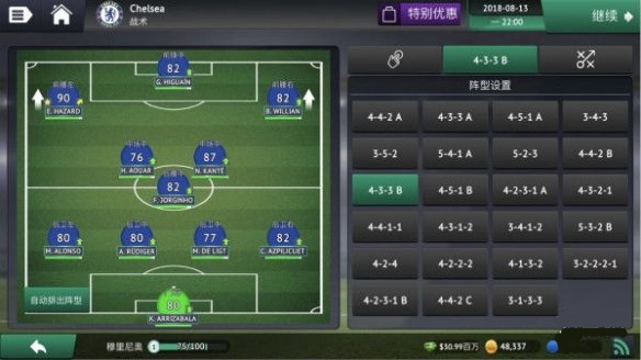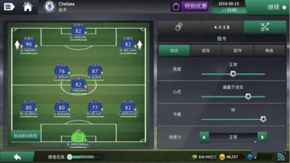 咱们还用小编最爱的切尔西来举例,切尔西的初始阵容后卫线人强马壮,左后卫、右后卫、中后卫都有强人坐镇,所以使用最保险的四后卫阵型就很好。关于中前场,中前卫人才最多,前腰和边锋位置上有阿扎尔、威廉和佩德罗,也足够用,只是中锋位置比较薄弱,只有伊瓜因实力较强,所以我认为4321阵型是最适合的,这个阵型,可以把切尔西队里实力最强的球队都放到首发里。