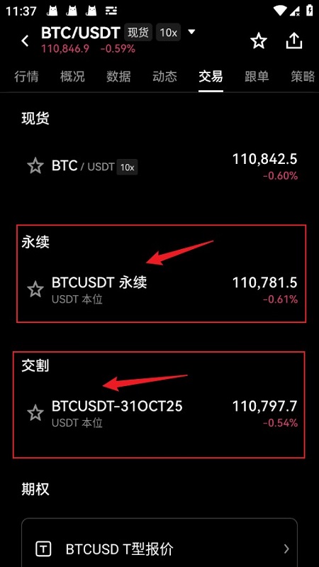 选择合约类型(永续或交割)。