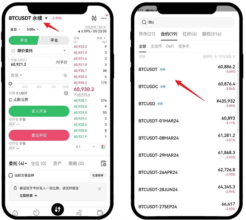 选择你想交易的永续合约交易对,如BTC-USDT永续合约、ETH-USDT永续合约等。