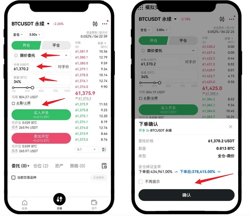 输入合约数量,确认下单。