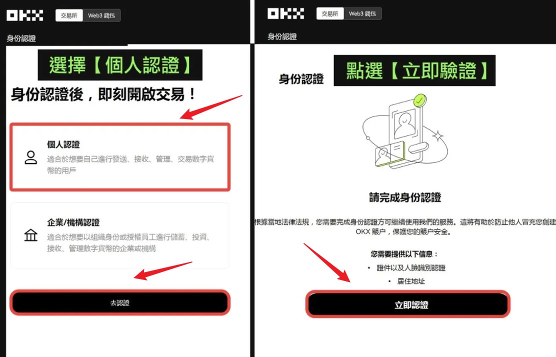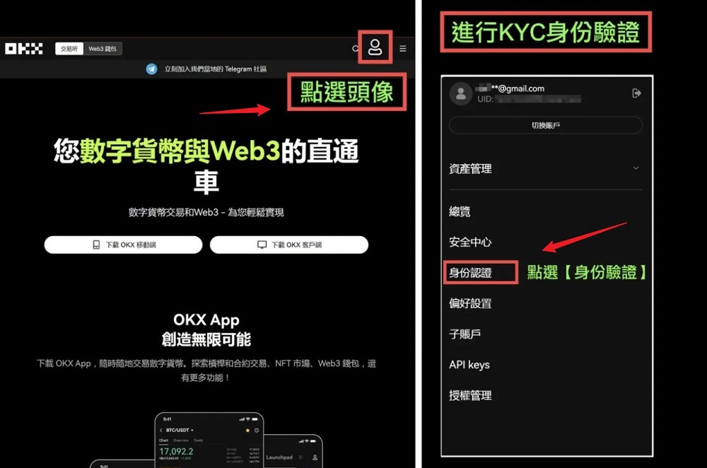 1.打开OKX网页首页,点选【身份验证】,进行KYC身份验证。