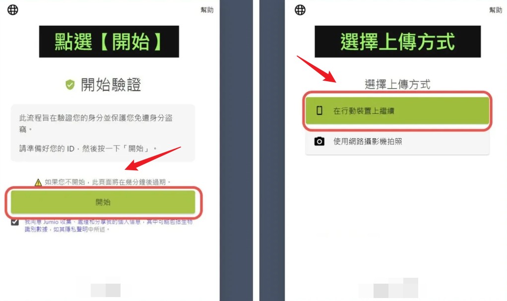 3.连结手机验证身份,按下【开始】,选择【上传方式】。