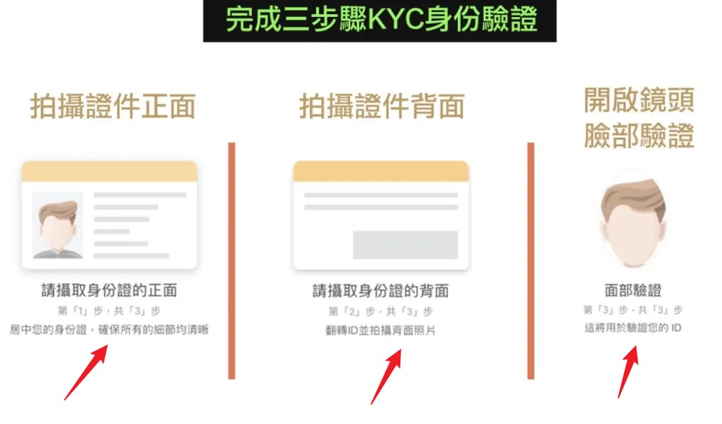 4.完成三步骤KYC身份验证,拍摄证件正面、背面、以及完成脸部验证。