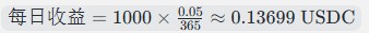 如果你存入了1000USDC,并且年化收益率是5%(0.05),那么你每天的收益大约是: