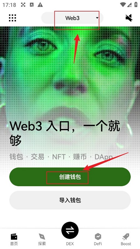 2、在首页最上方将模式切换为Web3,然后点击创建钱包按钮;