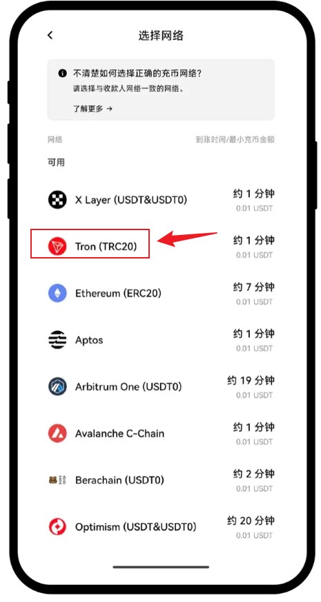 3.选择链(如TRC20手续费低)→ 复制充值地址