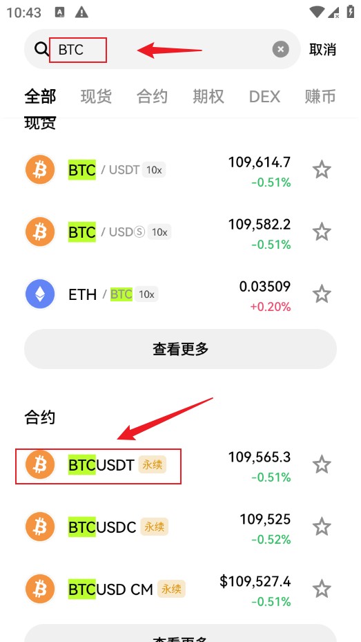 点击顶部搜索框,搜索并选择交易对(如BTCUSDT永续)