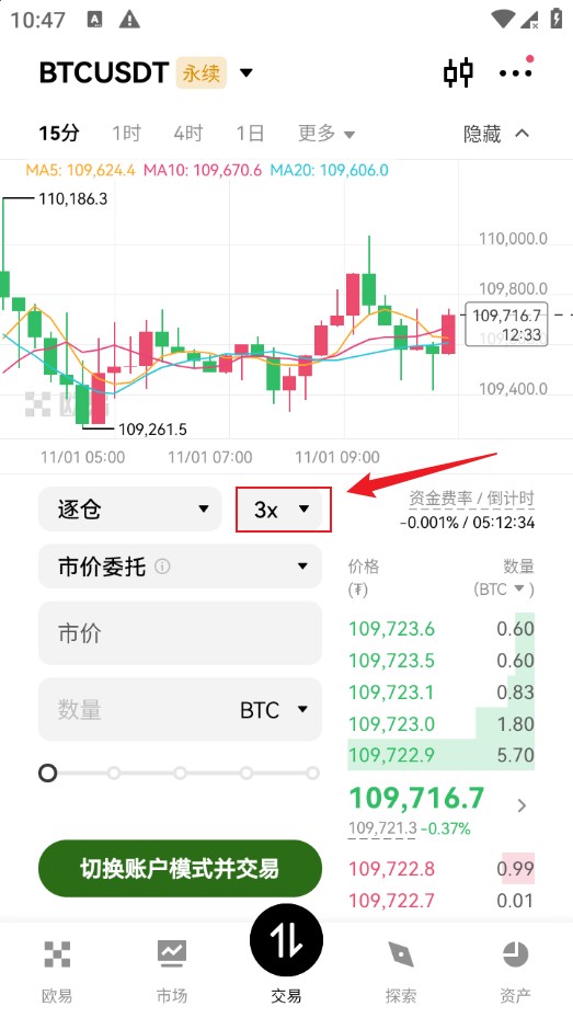 1.进入到BTCUSDT永续界面后,点击界面中的调整杠杆