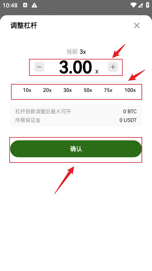 2.进入到调整杠杆页面后,下方可以根据自己的实际需求灵活调整杠杆倍数,最高可以调100X(杠杆越高,强平价格越接近当前价),调整好倍数后,点击确定按钮;