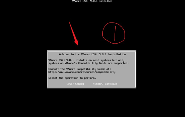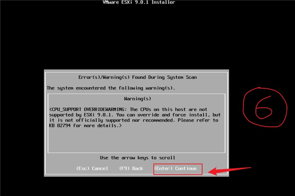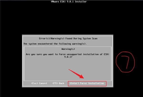 7.这里会进行警告,意思大概就是您确定强制安装不受支持的ESXI 9.0.1版本吗,我们按Enter键继续;