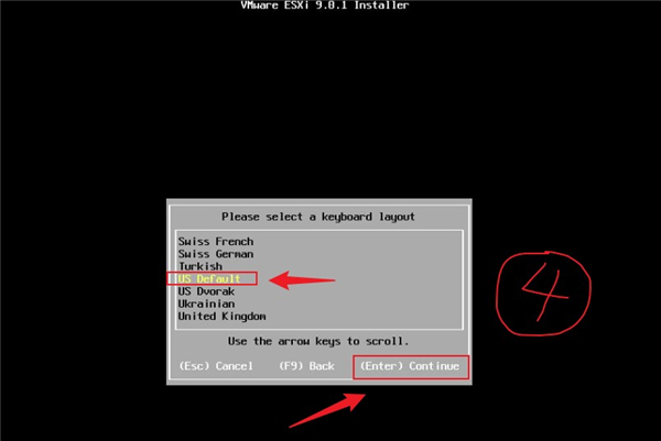 4.进入到Please select a keyboard layout这里,请选择键盘布局,这里我们选择US Default,按Enter键继续;