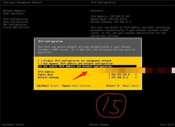 15.用空格选择第三项,设置为静态IP,输入IP、子网掩码、网关;