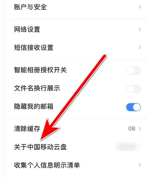 下滑找到关于中国移动云盘(或 "关于我们")