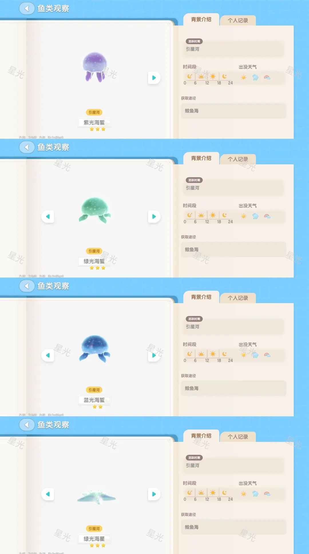 4.绿光海星-鲸鱼海-全天气-中鱼影;如图7,可以先开图鉴,第二周有鱼潮!