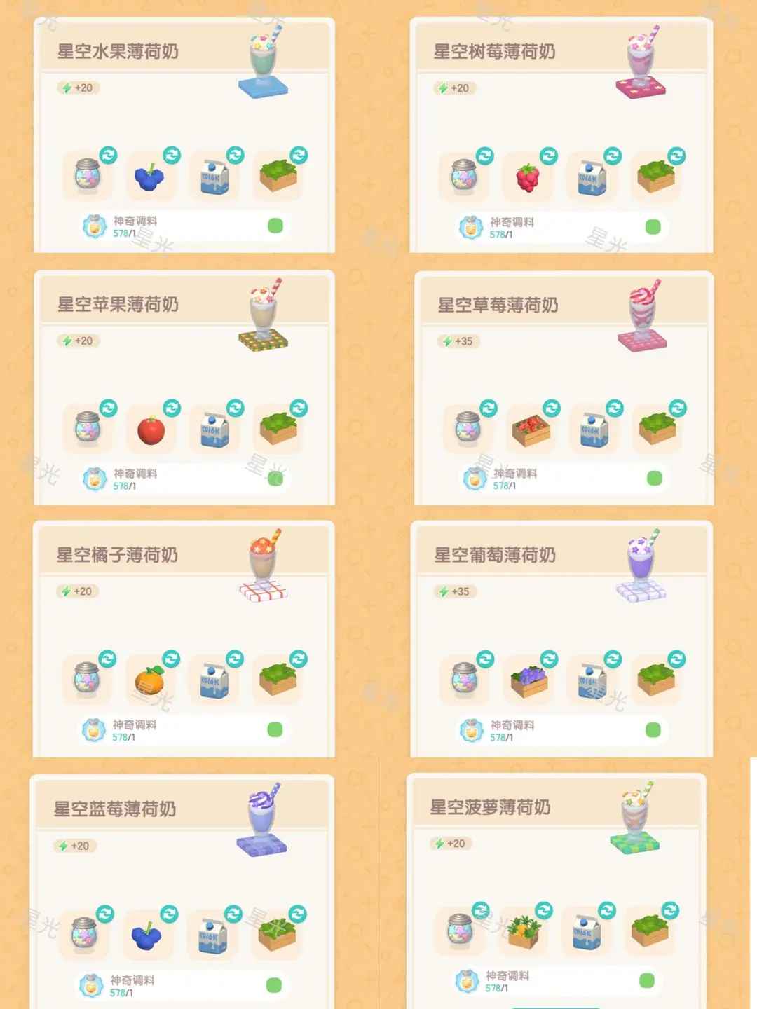 1.星空水果薄荷奶有8种食谱,如图4;