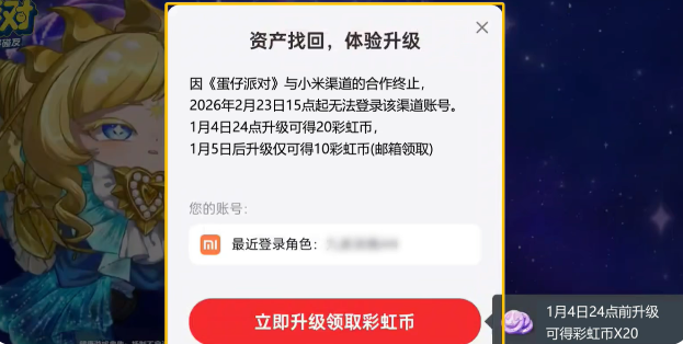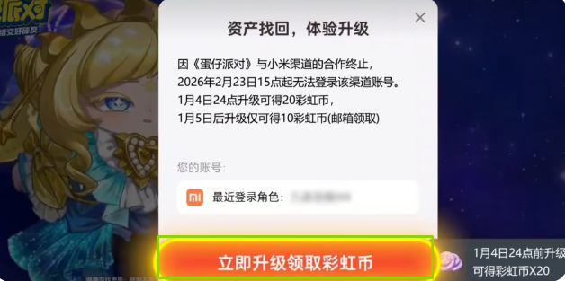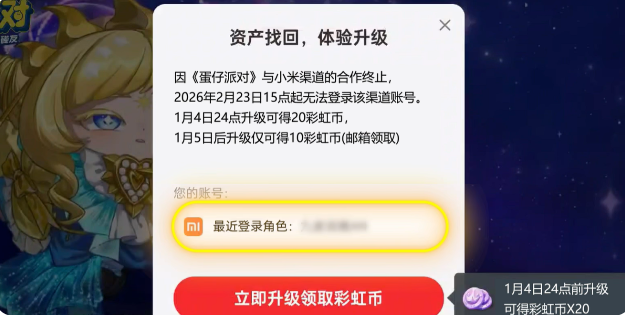 亲爱的蛋仔,由于与小米渠道合作运营策略的调整,《蛋仔派对》小米渠道版本手机游戏将于2026年02月23日15时在小米平台终止运营,现将相关事项通知如下:2025年12月22日10时:关闭游戏在小米平台的下载入口,玩家将无法下载游戏,同时停止游戏充值、新用户注册;2026年02月23日15时:正式停止游戏在小米平台的运营,玩家将无法通过小米端口登录游戏。为保证您游戏体验的完整性,我们将同步开启资产找回服务。在角色资产找回后,即可使用网易账号体验游戏,所有角色信息不变。越早找回资产可获得的奖励越多,渠道停运后您的资产可能会丢失,请尽快找回!