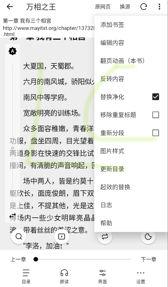 书源管理:软件内置1576条书源,首次打开自动导入,用户可自定义导入书源,遇到章节加载异常、内容缺失时,支持一键切换书源,保障阅读流畅性。