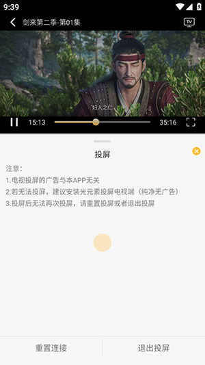 投屏功能:播放界面右上角提供投屏入口,可快速搜索投屏设备,实现大屏观影。