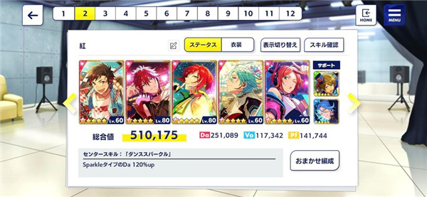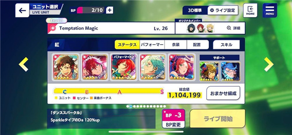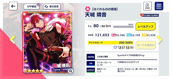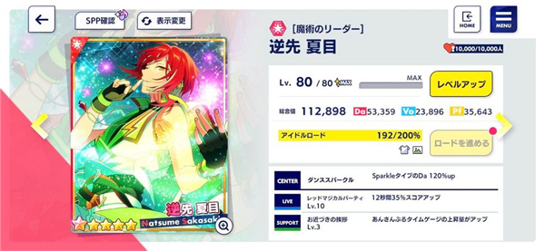 那我们所有队员就必须是「Sparkle类型」和「特化能力值为Da」的卡片,就出现以下组合:会发现队伍皆为Sparkle,最高特化值为Da,这样所有队员都可以吃到夏目的队长技,能力值最大化。而这就是「同特化能力」的组法。