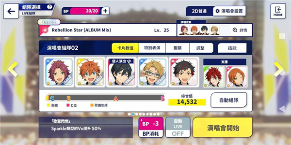 资源管理与培养:前期升级较快,后期需珍惜体力,调整BP消耗平衡奖励与性价比;培养角色时注意平衡能力,避免资源过度集中;低星卡片可解锁MV队服,部分二星卡片能展现角色风采,五星卡片第四次突破可解锁服装染色。