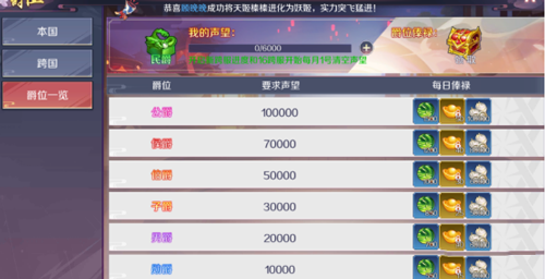 声望的第二个奖励就是爵位,通过提高声望来提升爵位,每天可以领取一次爵位奖励,而爵位越高获得的奖励也越多哦