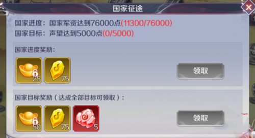 说到声望,还涉及到另外三个奖励,第一个就是国家征途,只要完成条件,就可以直接领取奖励,其中的有些条件就是声望,而且有非常多的宝箱可以开哦