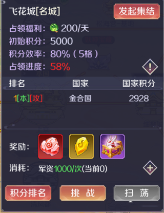 第二种就是每天的城池结算奖励,每天19点30分进行结算。主要奖励内容是套装石、贡玉、宝石、图腾装备,只要占领的某些城池,就可以获得城池,就可以领取到城池旁边的宝藏。这个奖励是本国内所有玩家都可以获得的,属于群体奖励,所以大家都要尽自己的一份力,尽量占领更多的城池来帮助本国成员获得更多的资源,从而在总体上来提升本国的实力